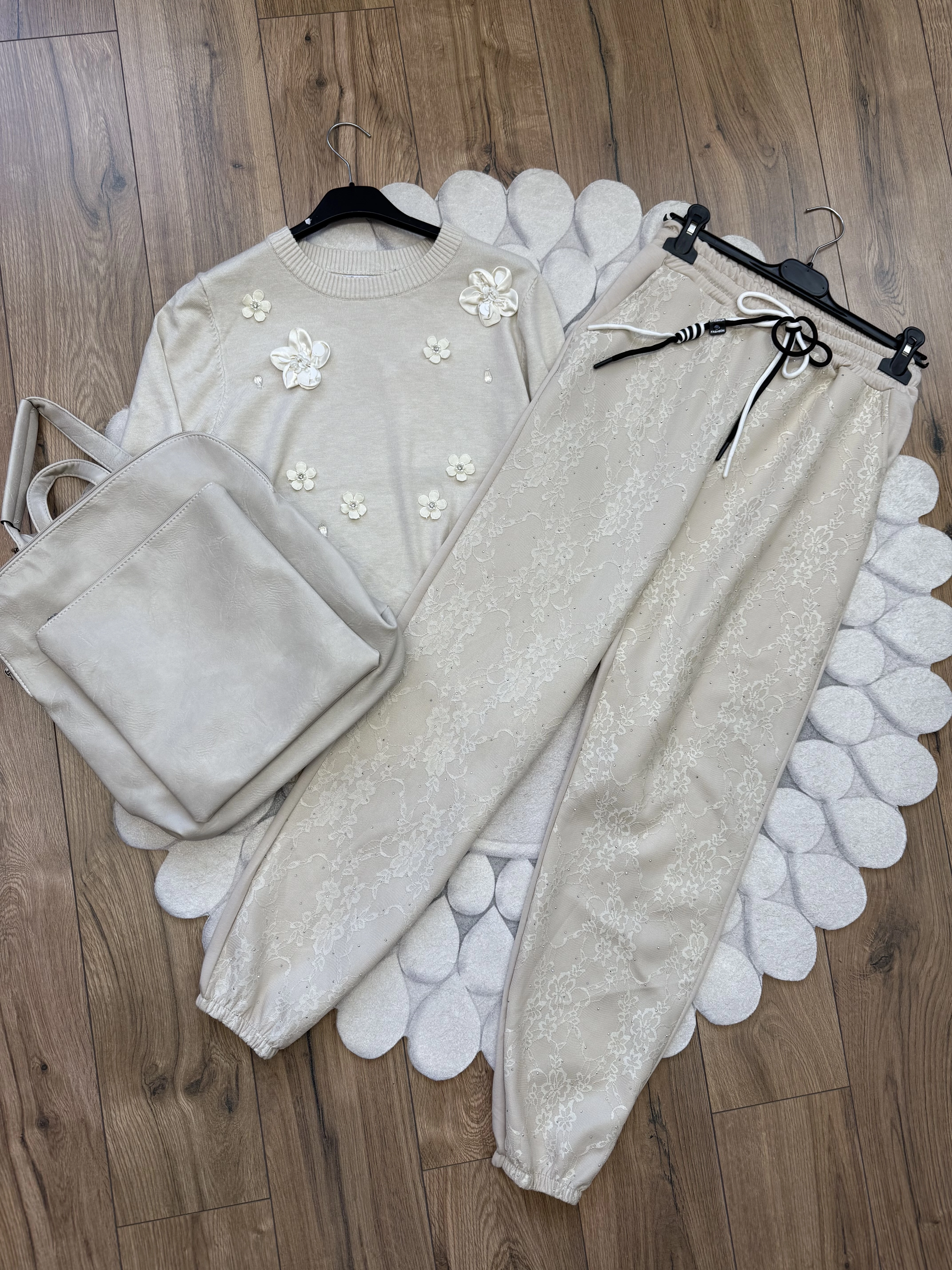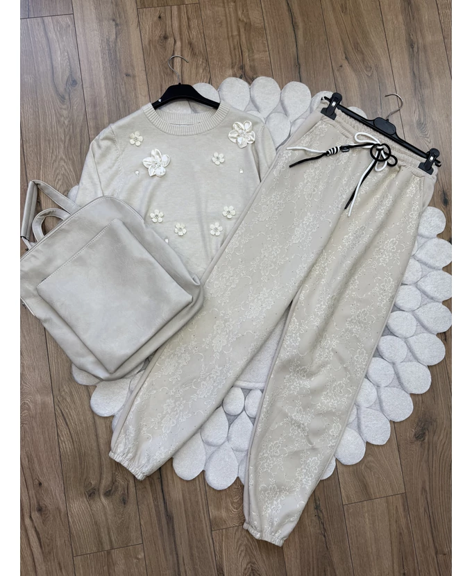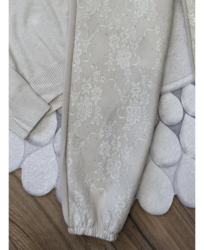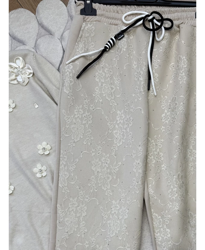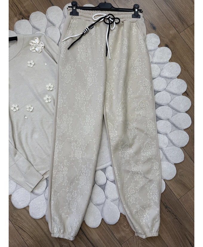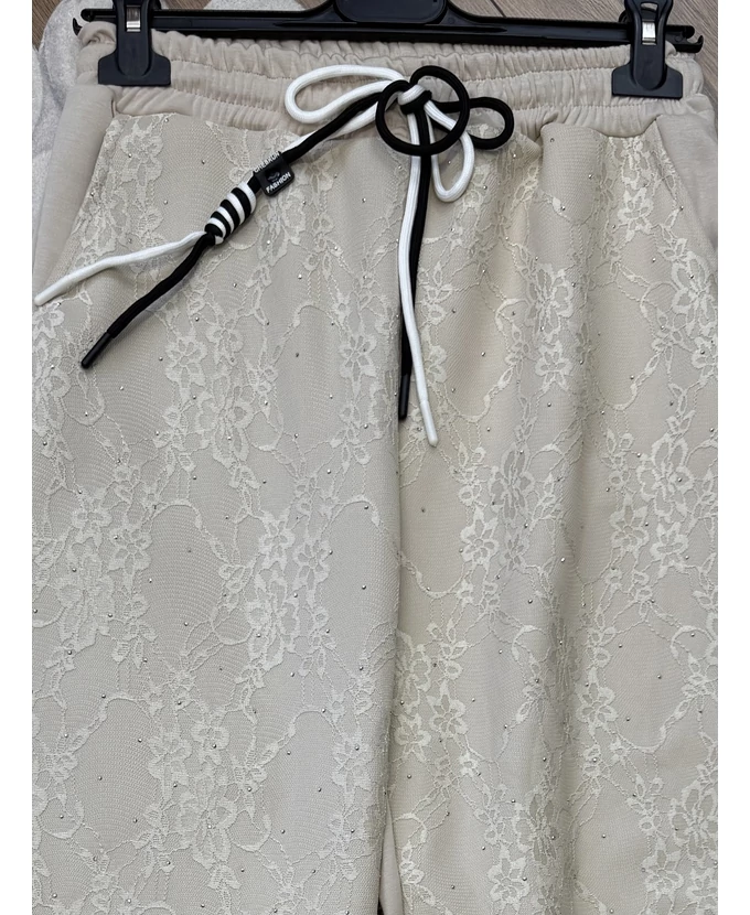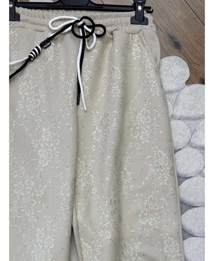 Stílusos csipkemintás nadrág megkötős derékrésszel, amely egyszerre kényelmes és nőies.