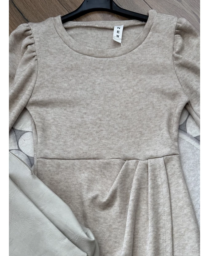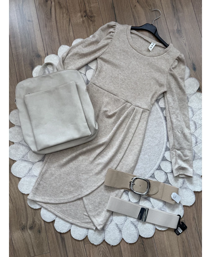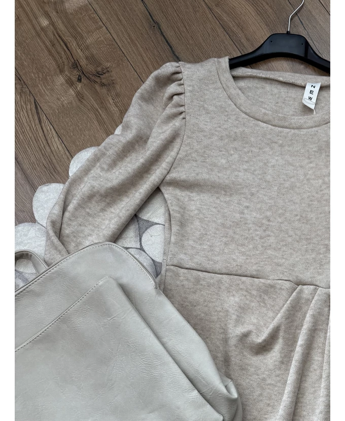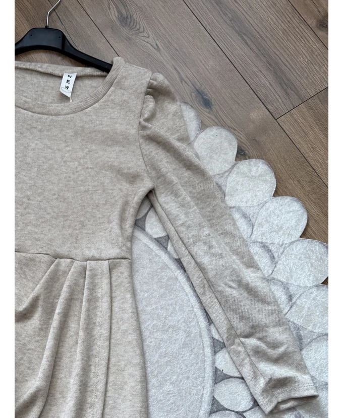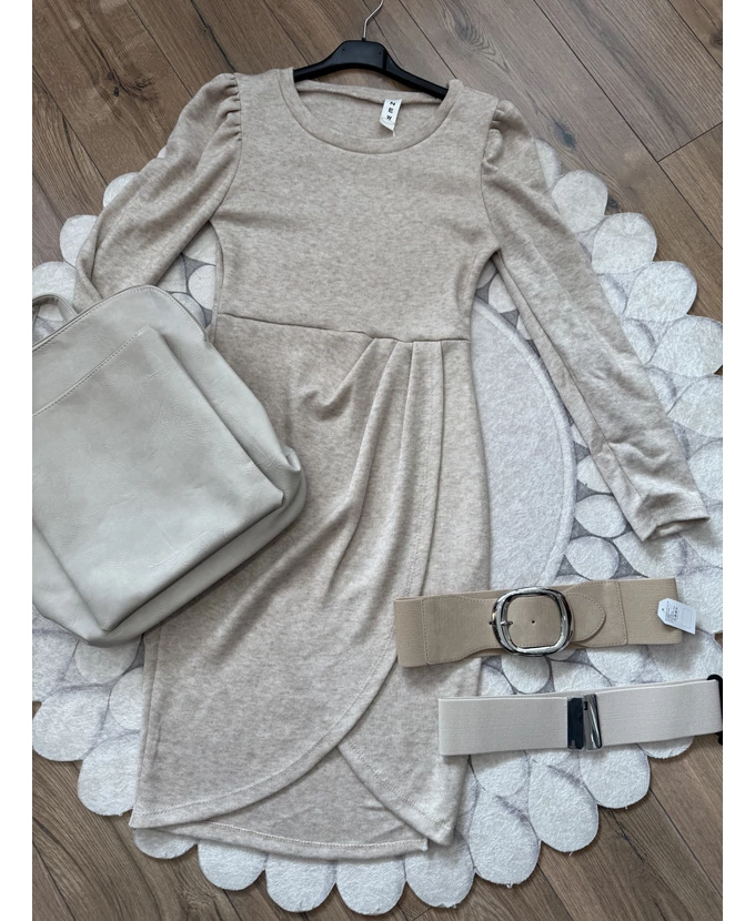 Puha tapintású ruha, átlapolós szoknyarésszel és fodros vállakkal, egyszerre kényelmes és nőies.