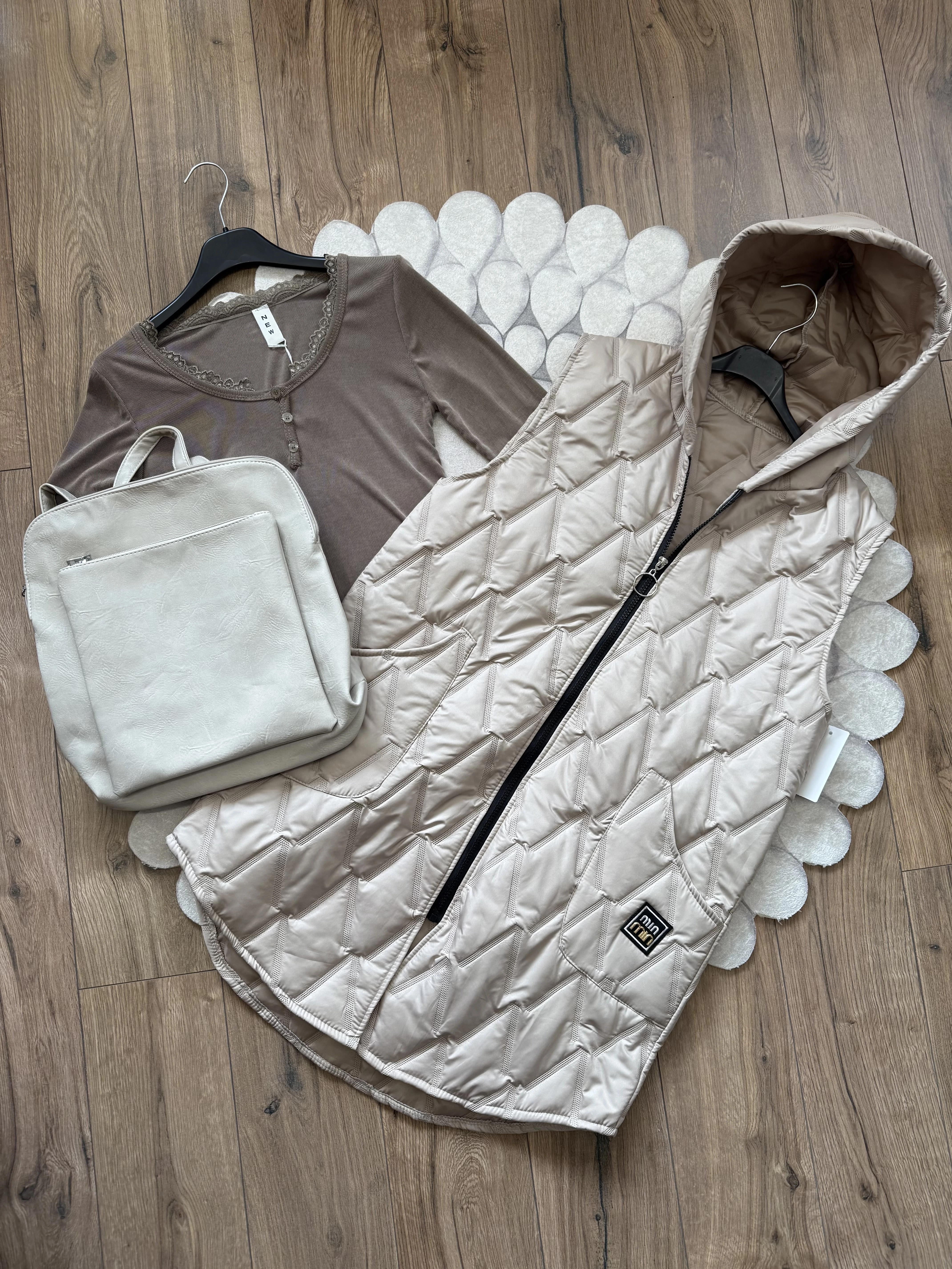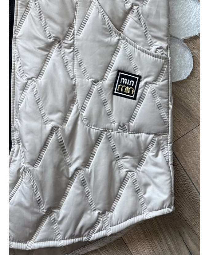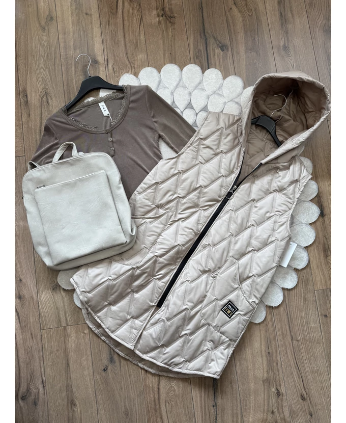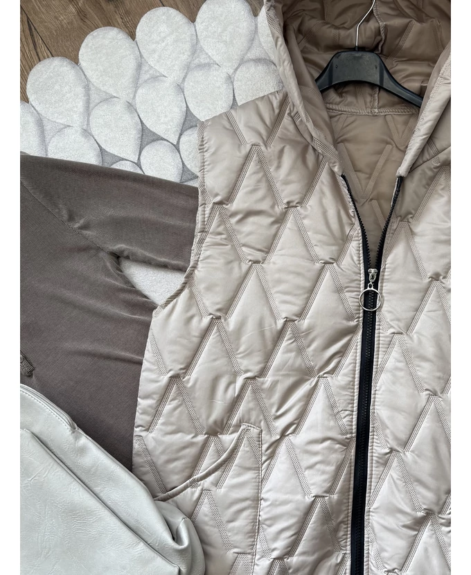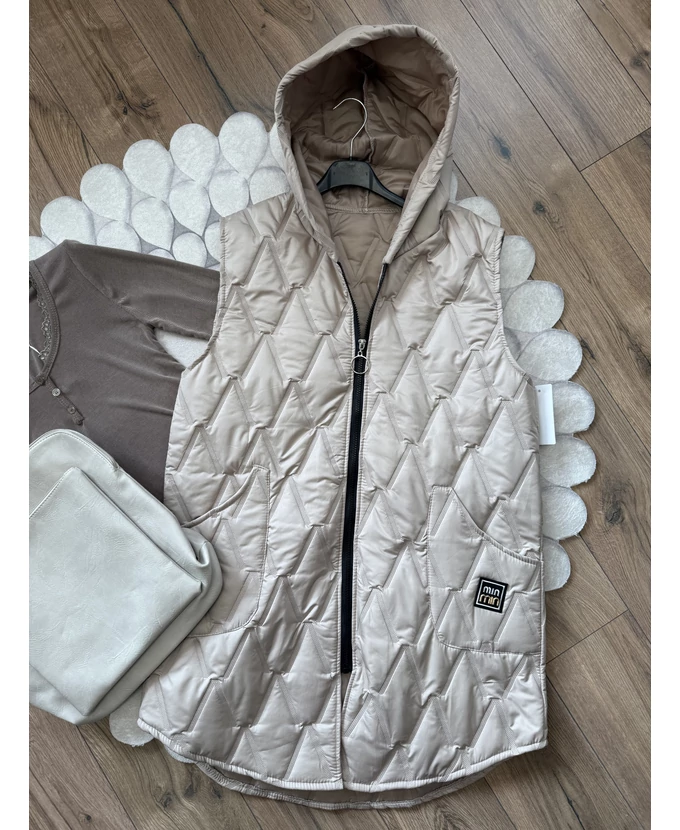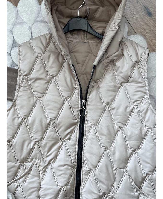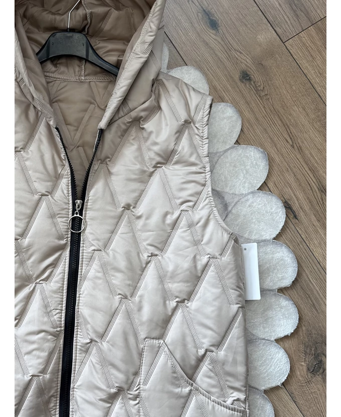 Cipzáras, szteppelt mellény kapucnival és elöl praktikus zsebekkel.