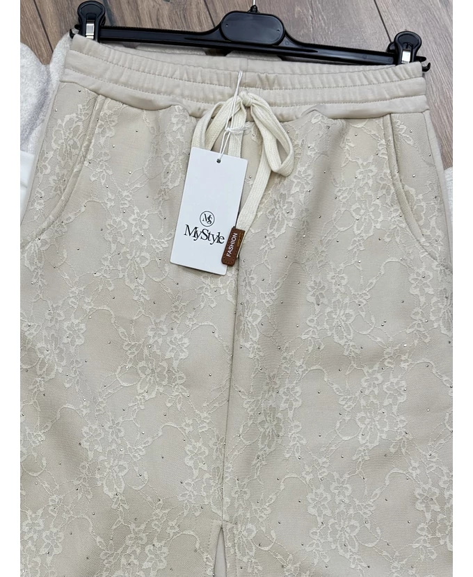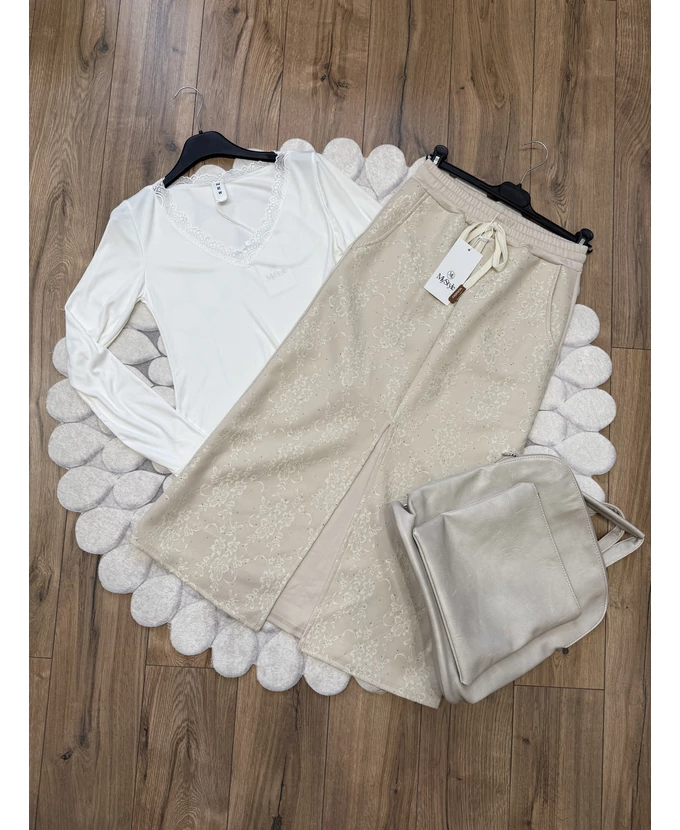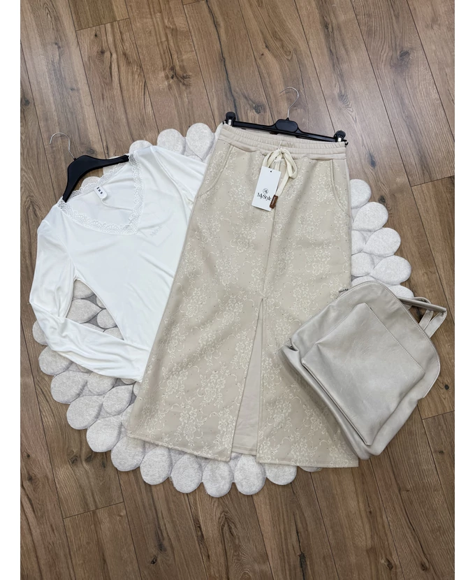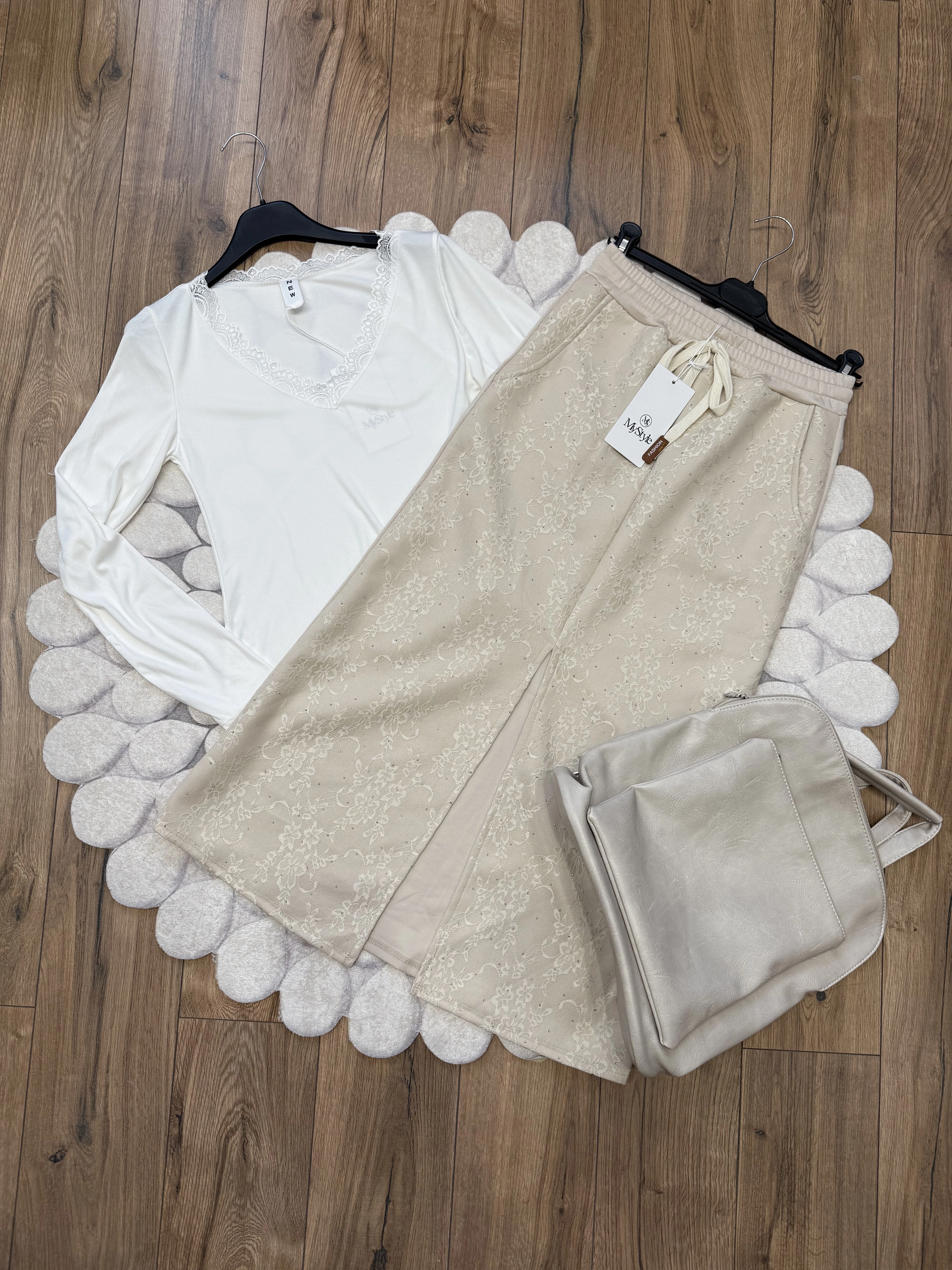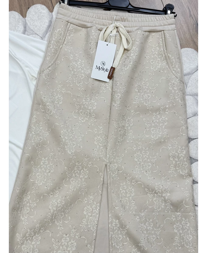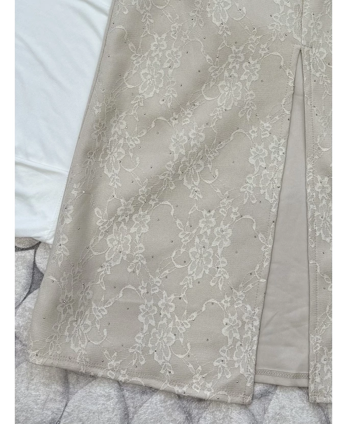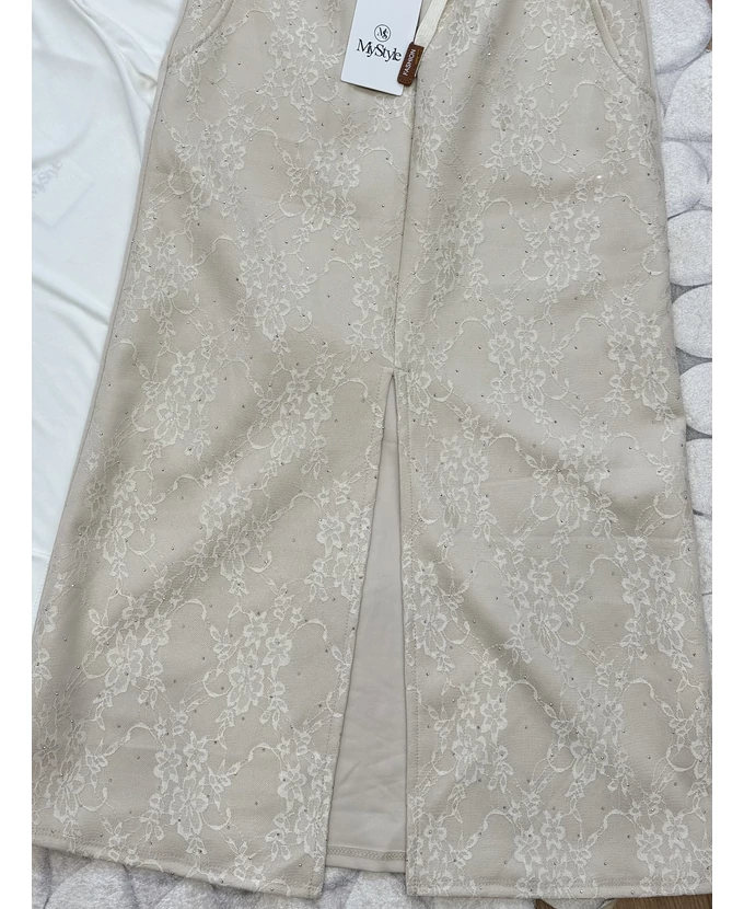 Különleges csipkemintás szoknya megkötővel, felsliccelt fazon, csillogó strasszköves díszítéssel.