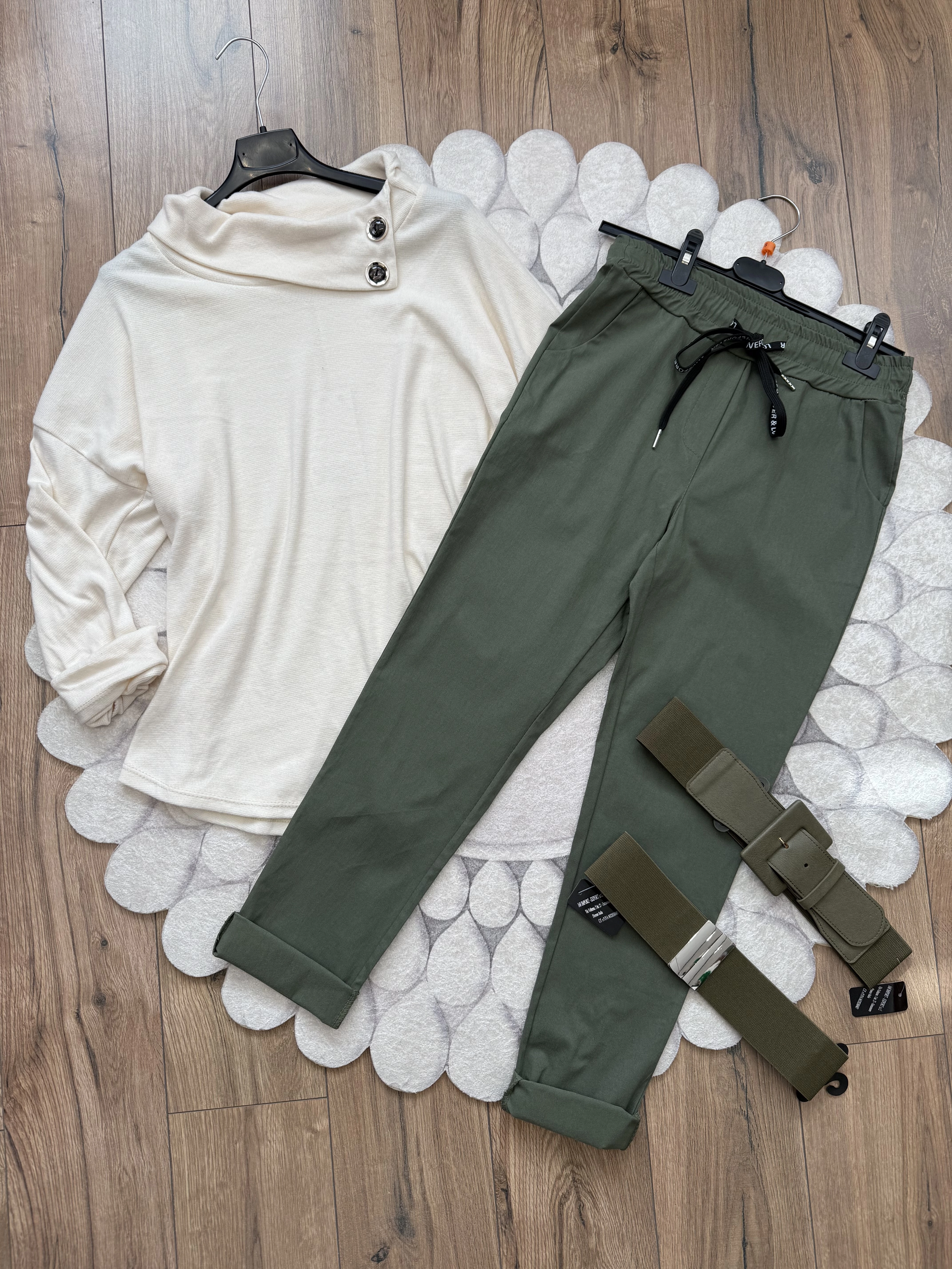 Kényelmes és sportos, rugalmas anyagú nadrág, a derekán megkötővel.