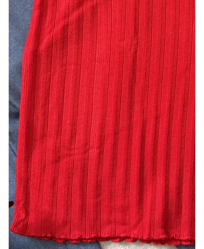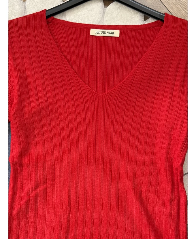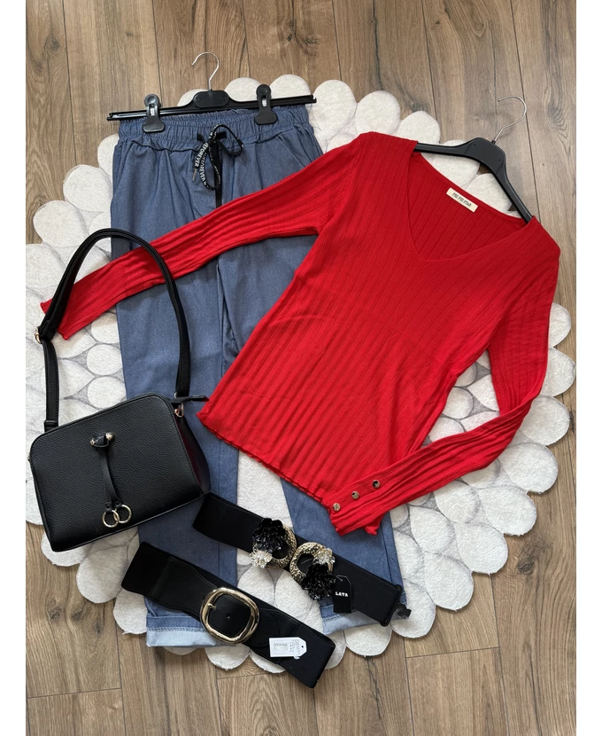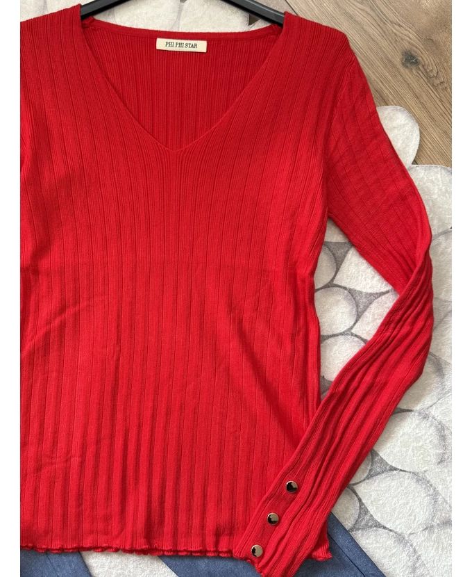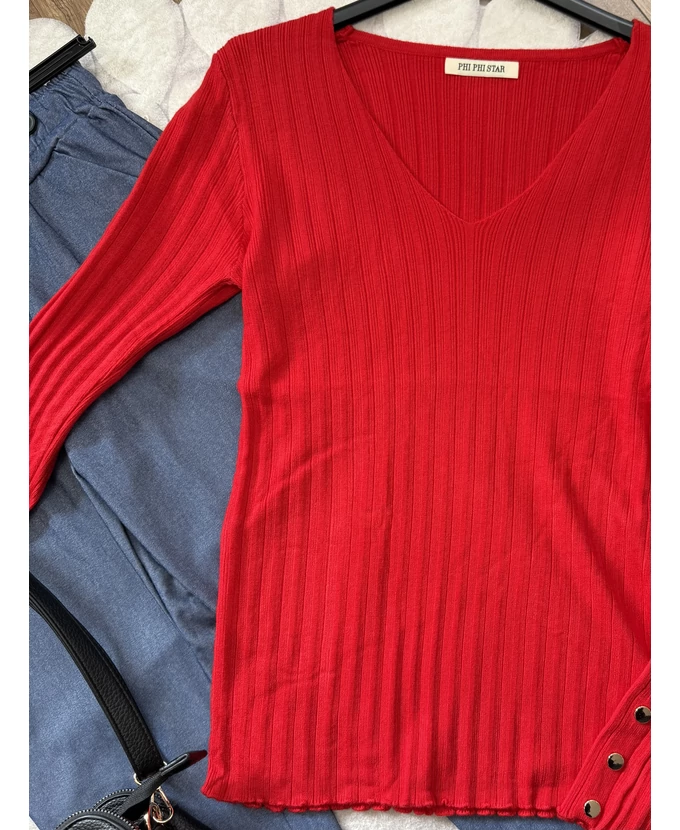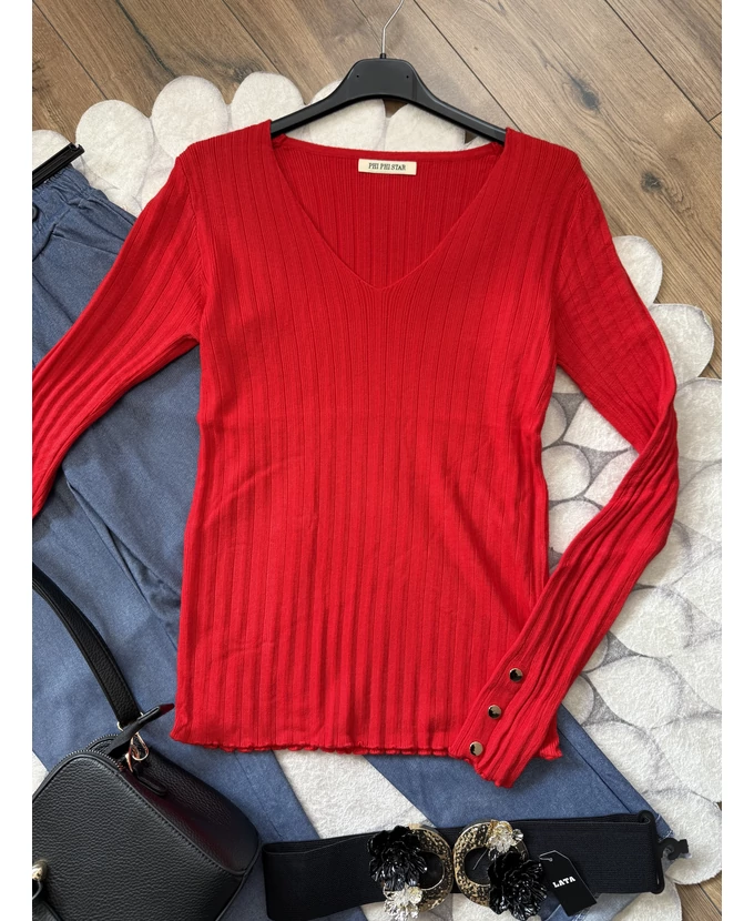 Piros díszgombos V-nyakú pulóver